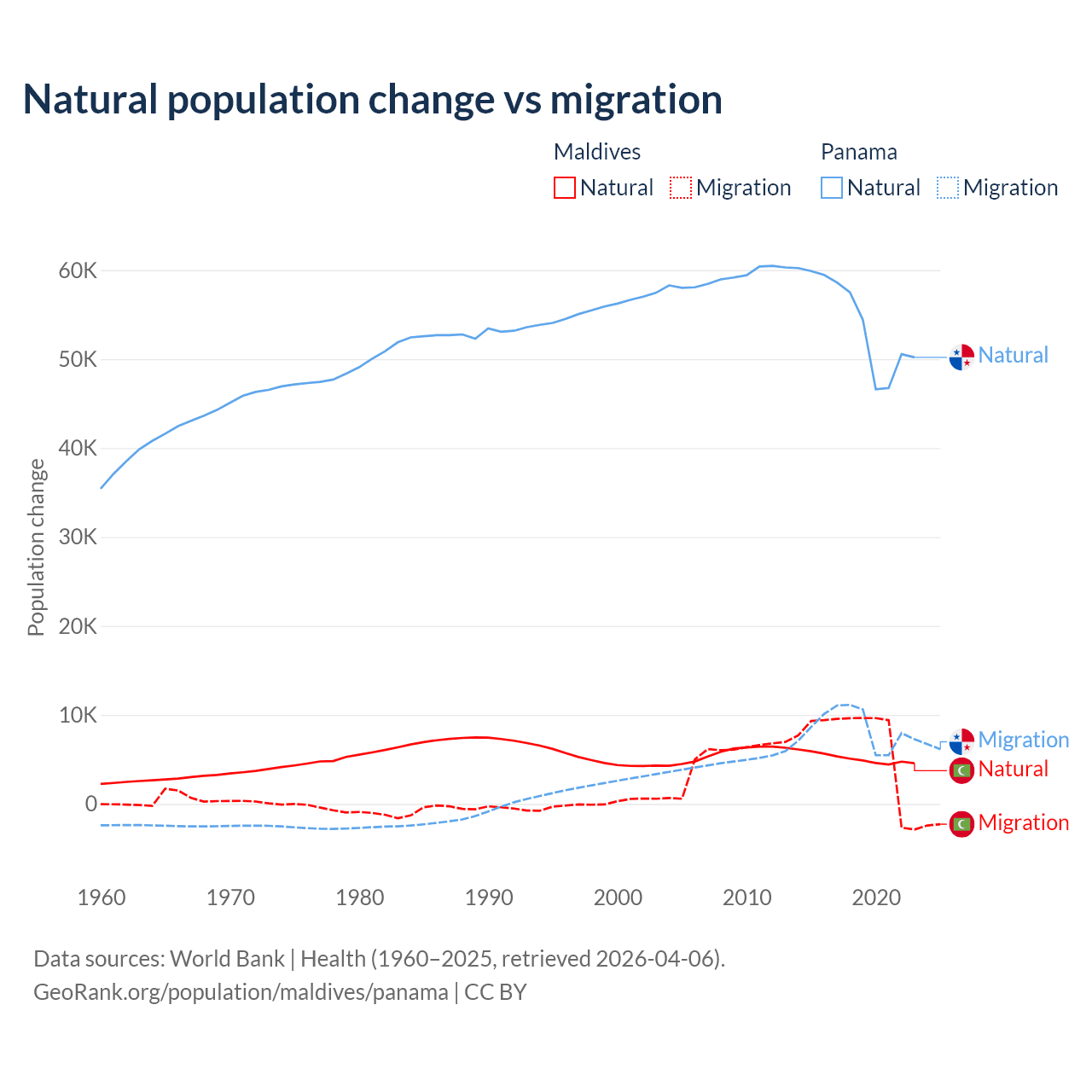 Over the last 10 years, 42.7% of the population change in Maldives is from natural causes (a gain of 51,342 people) and 57.3% is from migration (a gain of 68,788 people). In Panama 86.5% is from natural causes (a gain of 544,211 people) and 13.5% is from migration (a gain of 84,849 people).