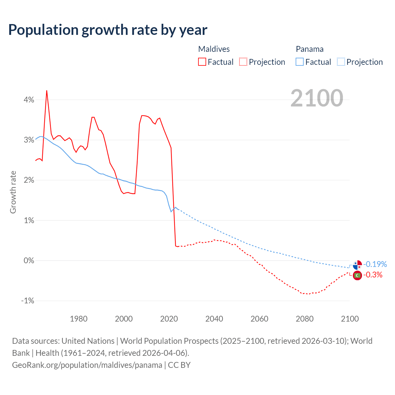 - For the last 10 years, Maldives has had an average growth rate of +2.56% per year vs +1.52% in Panama.