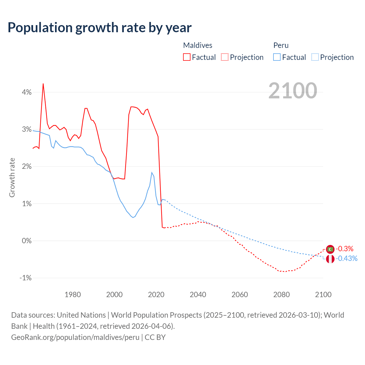 - For the last 10 years, Maldives has had an average growth rate of +2.56% per year vs +1.26% in Peru.