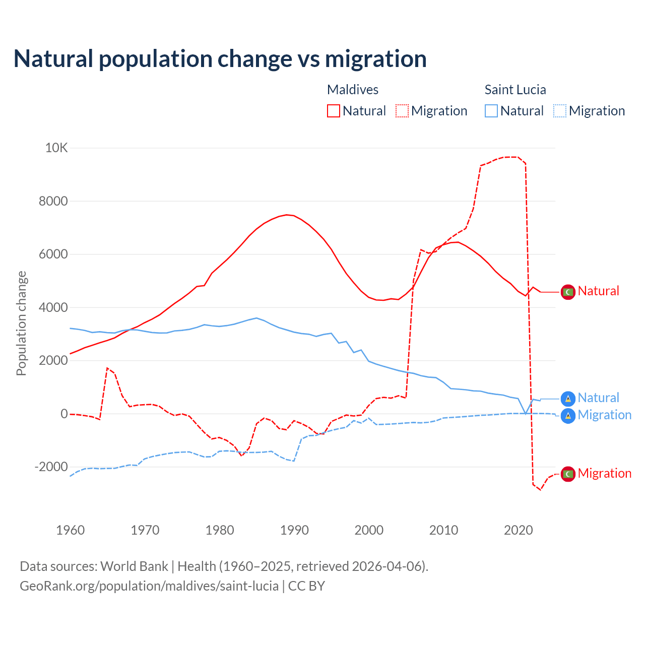 Over the last 10 years, 42.7% of the population change in Maldives is from natural causes (a gain of 51,342 people) and 57.3% is from migration (a gain of 68,788 people). In Saint Lucia 95.7% is from natural causes (a gain of 6,039 people) and 4.31% is from migration (a loss of 272 people).