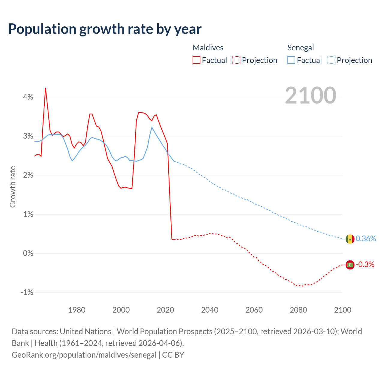 - For the last 10 years, Maldives has had an average growth rate of +2.56% per year vs +2.76% in Senegal.