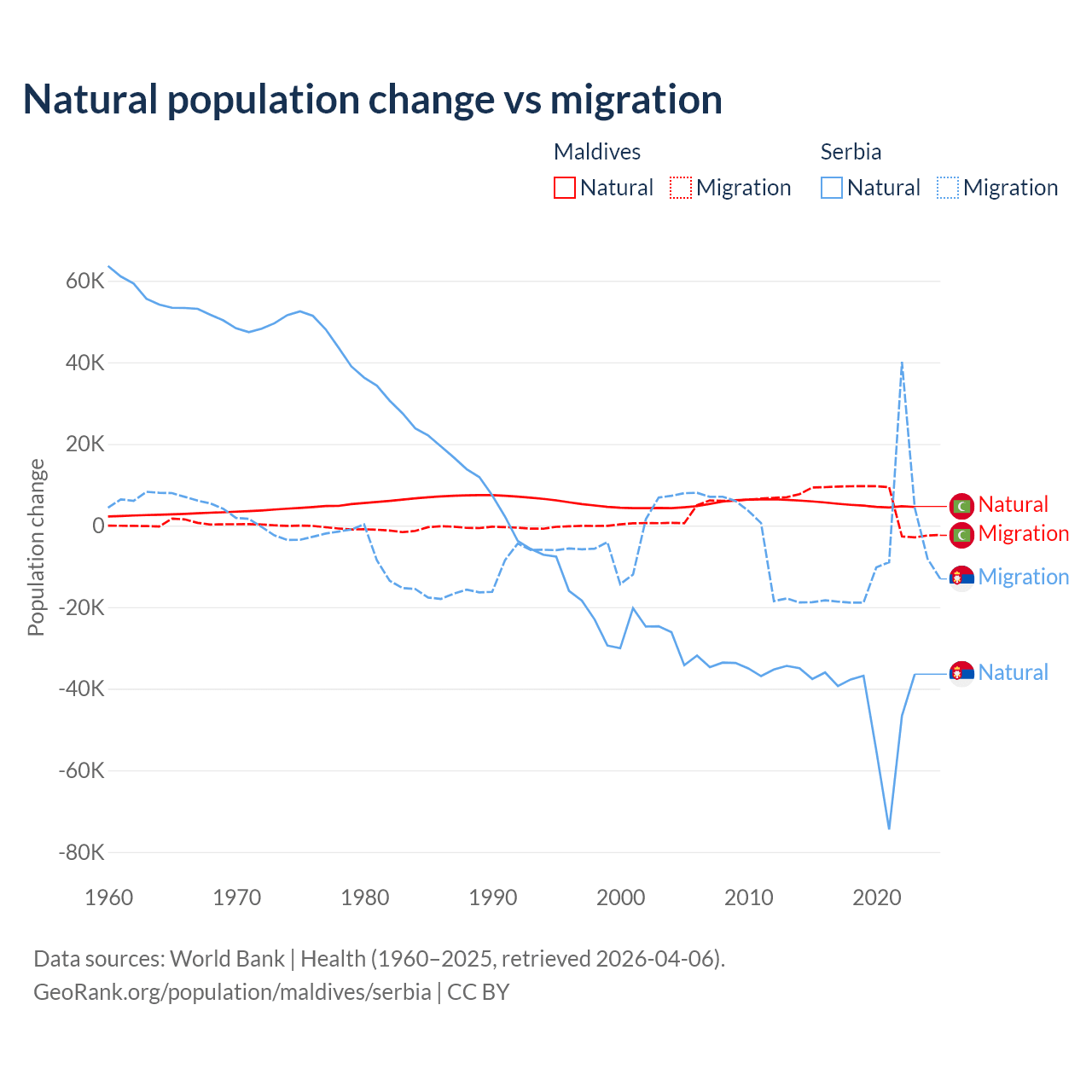 Over the last 10 years, 42.7% of the population change in Maldives is from natural causes (a gain of 51,342 people) and 57.3% is from migration (a gain of 68,788 people). In Serbia 83.3% is from natural causes (a loss of 435,148 people) and 16.7% is from migration (a loss of 87,110 people).