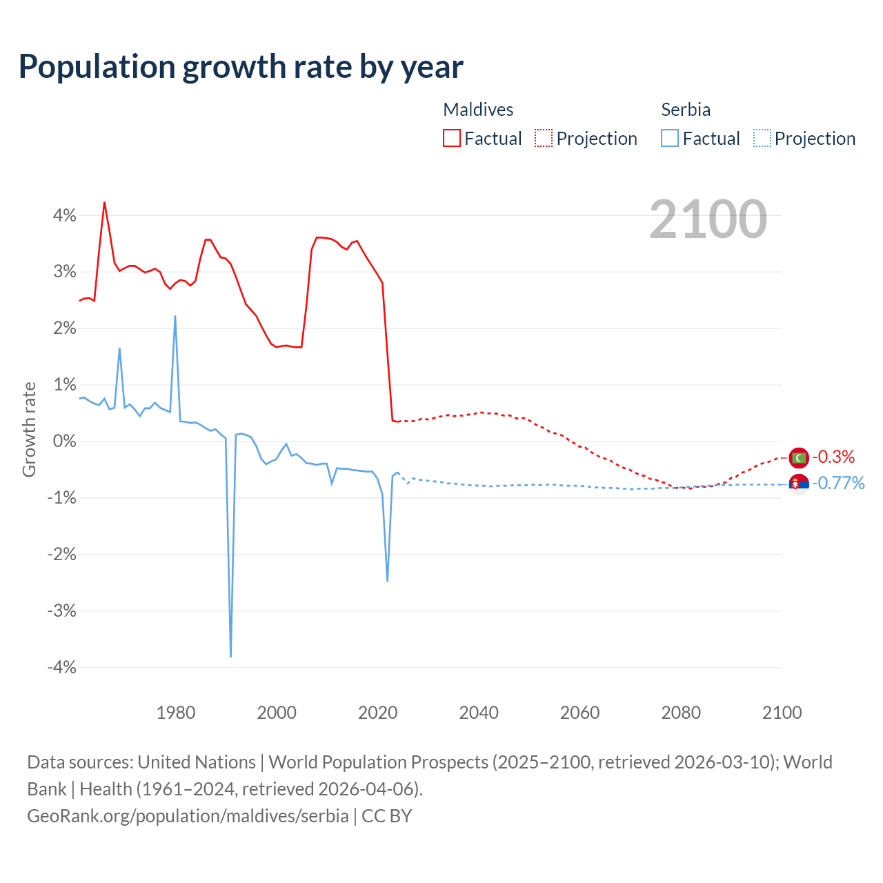 - For the last 10 years, Maldives has had an average growth rate of +2.56% per year vs -0.76% in Serbia.