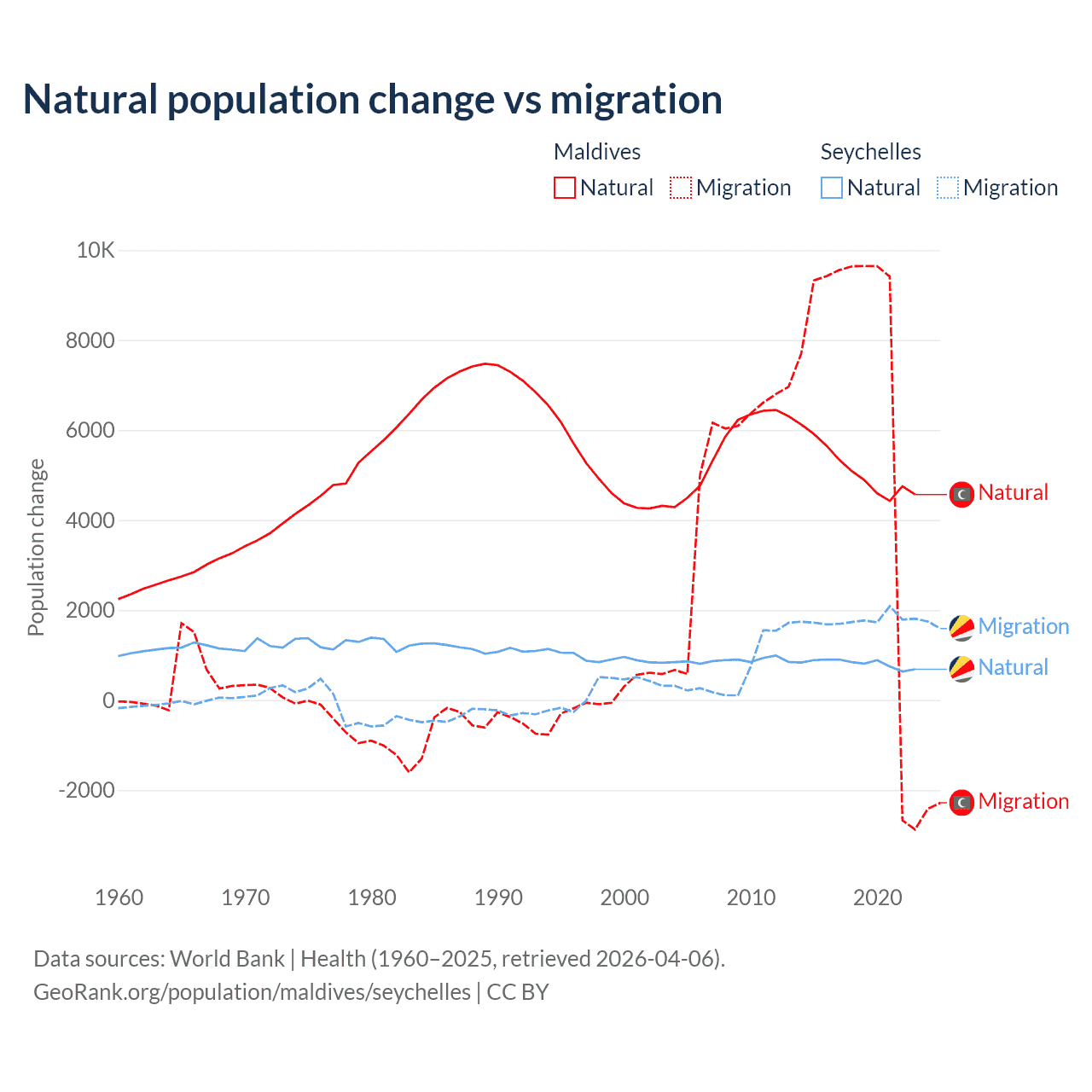 Over the last 10 years, 42.7% of the population change in Maldives is from natural causes (a gain of 51,342 people) and 57.3% is from migration (a gain of 68,788 people). In the Seychelles 31.4% is from natural causes (a gain of 8,122 people) and 68.6% is from migration (a gain of 17,748 people).