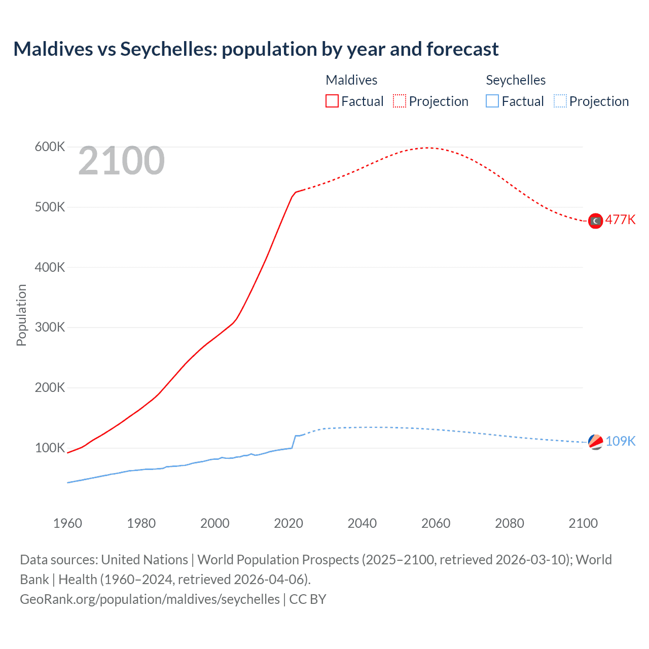 The latest officially reported population of Maldives was 527,799 in 2024 vs 121,354 people in the Seychelles in 2024. In 2026, based on the adjusted UN estimation, the current Maldives' population is 532,057 people compared to 126,311 in the Seychelles.