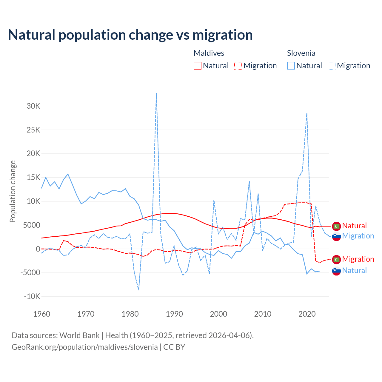 Over the last 10 years, 42.7% of the population change in Maldives is from natural causes (a gain of 51,342 people) and 57.3% is from migration (a gain of 68,788 people). In Slovenia 18.1% is from natural causes (a loss of 17,573 people) and 81.9% is from migration (a gain of 79,532 people).
