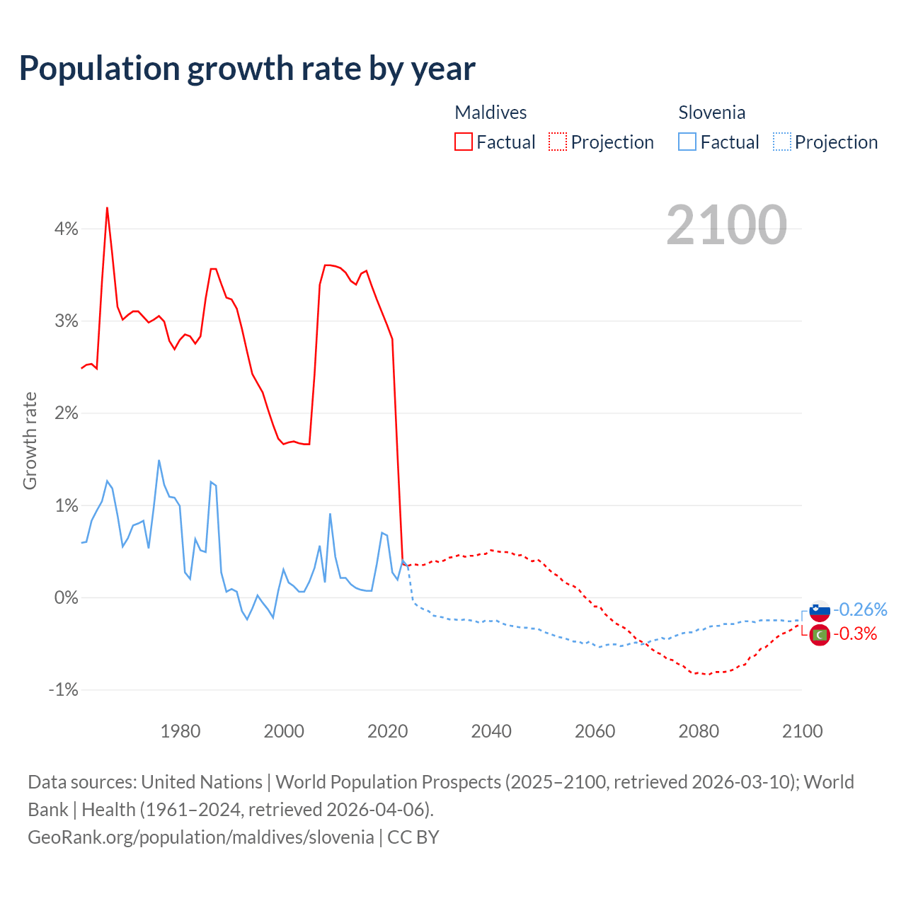 - For the last 10 years, Maldives has had an average growth rate of +2.56% per year vs +0.29% in Slovenia.