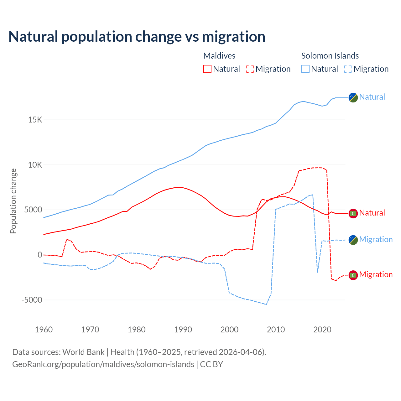 Over the last 10 years, 42.7% of the population change in Maldives is from natural causes (a gain of 51,342 people) and 57.3% is from migration (a gain of 68,788 people). In the Solomon Islands 82.8% is from natural causes (a gain of 168,727 people) and 17.2% is from migration (a gain of 35,031 people).