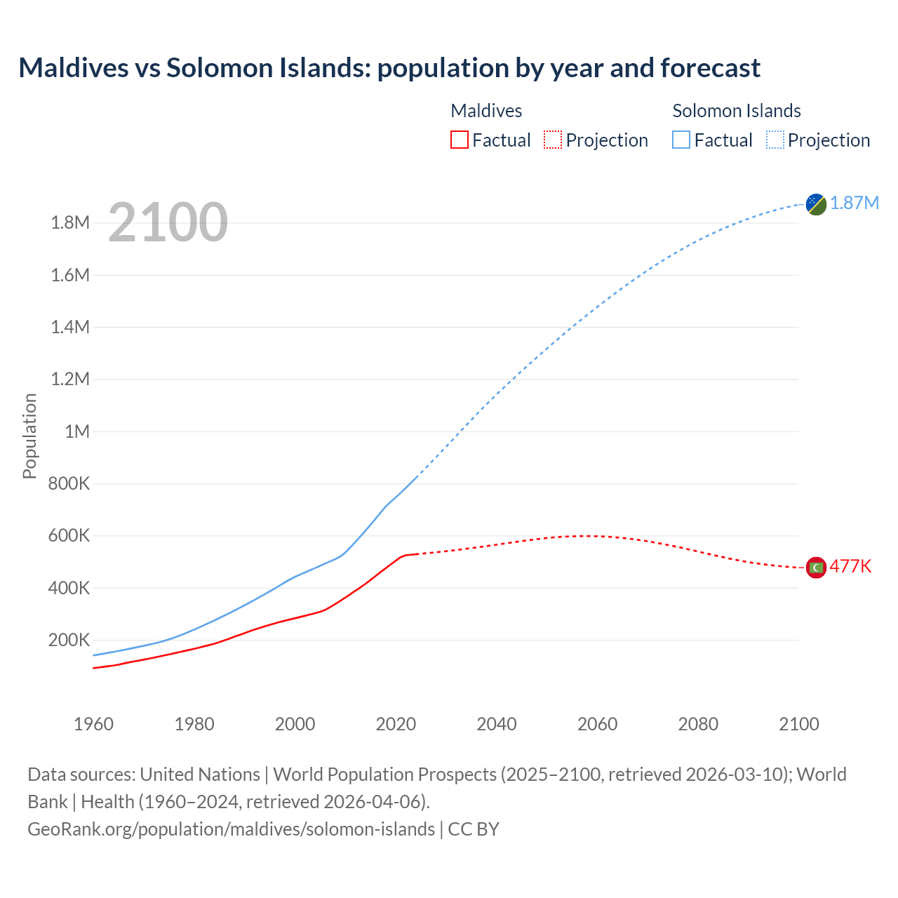 The latest officially reported population of Maldives was 527,799 in 2024 vs 819,198 people in the Solomon Islands in 2024. In 2026, based on the adjusted UN estimation, the current Maldives' population is 532,057 people compared to 863,951 in the Solomon Islands.