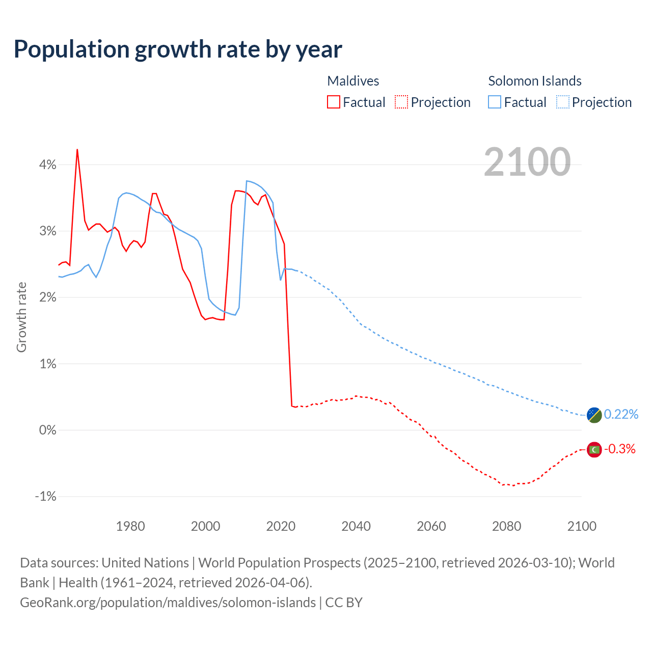 - For the last 10 years, Maldives has had an average growth rate of +2.56% per year vs +2.95% in the Solomon Islands.