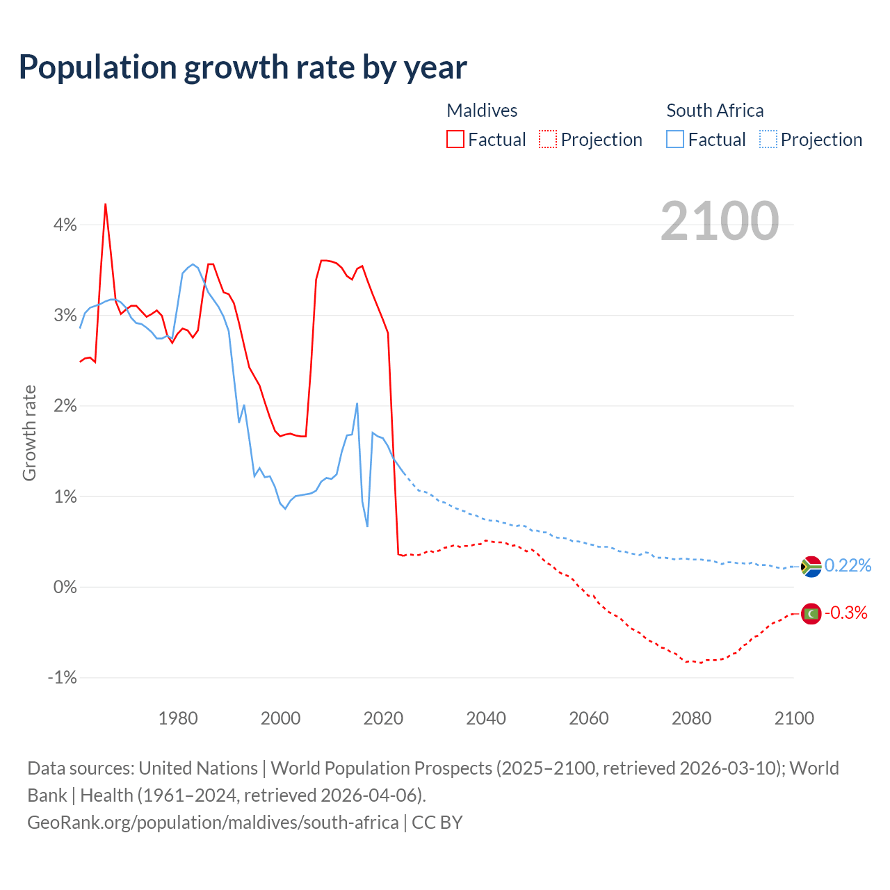 Data sources: World Bank | Health (1960–2024, retrieved 2026-04-06); United Nations | World Population Prospects (1960–2026, retrieved 2026-03-10); U.S. Census Bureau (1960–2025, retrieved 2026-02-08); Central Intelligence Agency (CIA) (2000–2019, retrieved 2026-02-20).