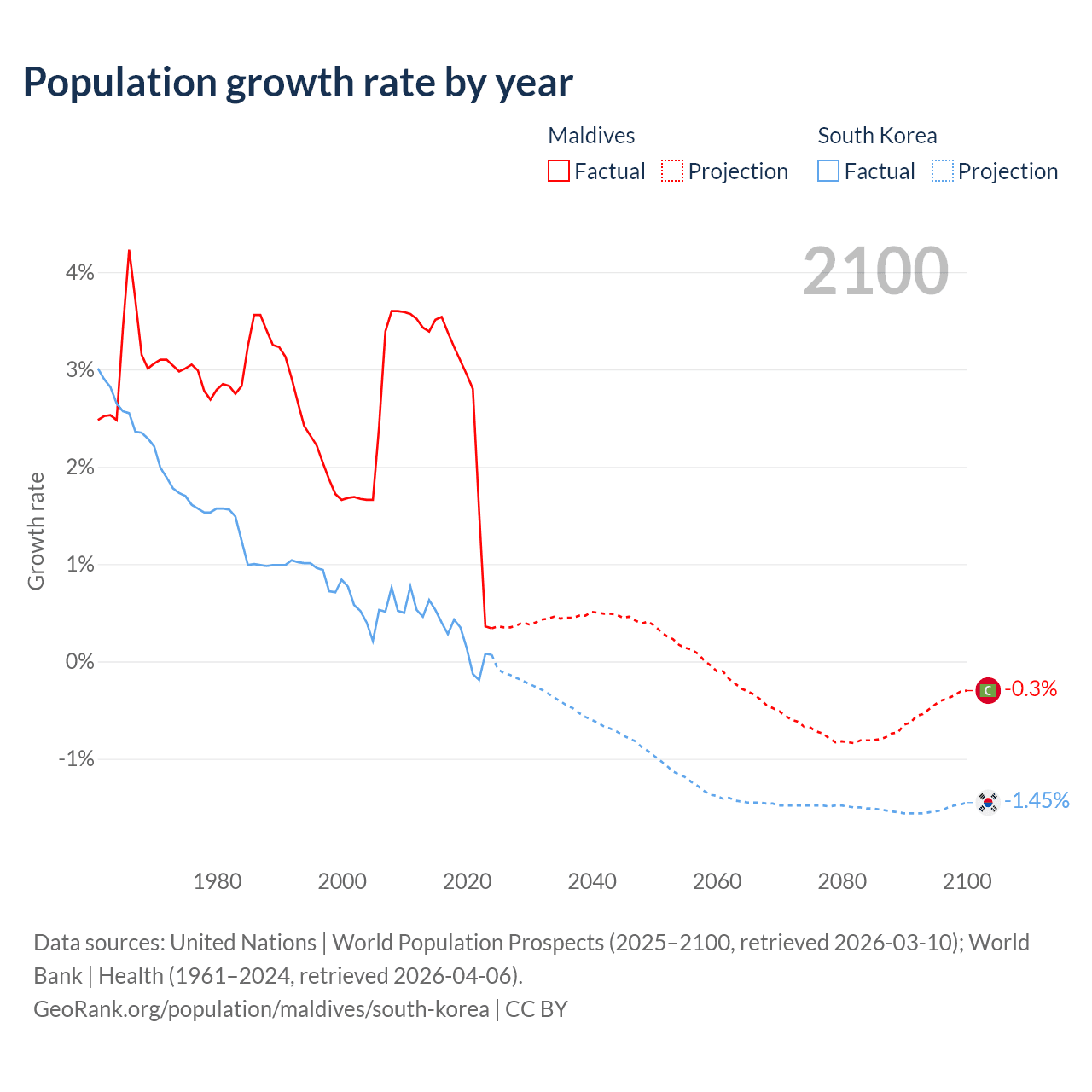 - For the last 10 years, Maldives has had an average growth rate of +2.56% per year vs +0.24% in South Korea.