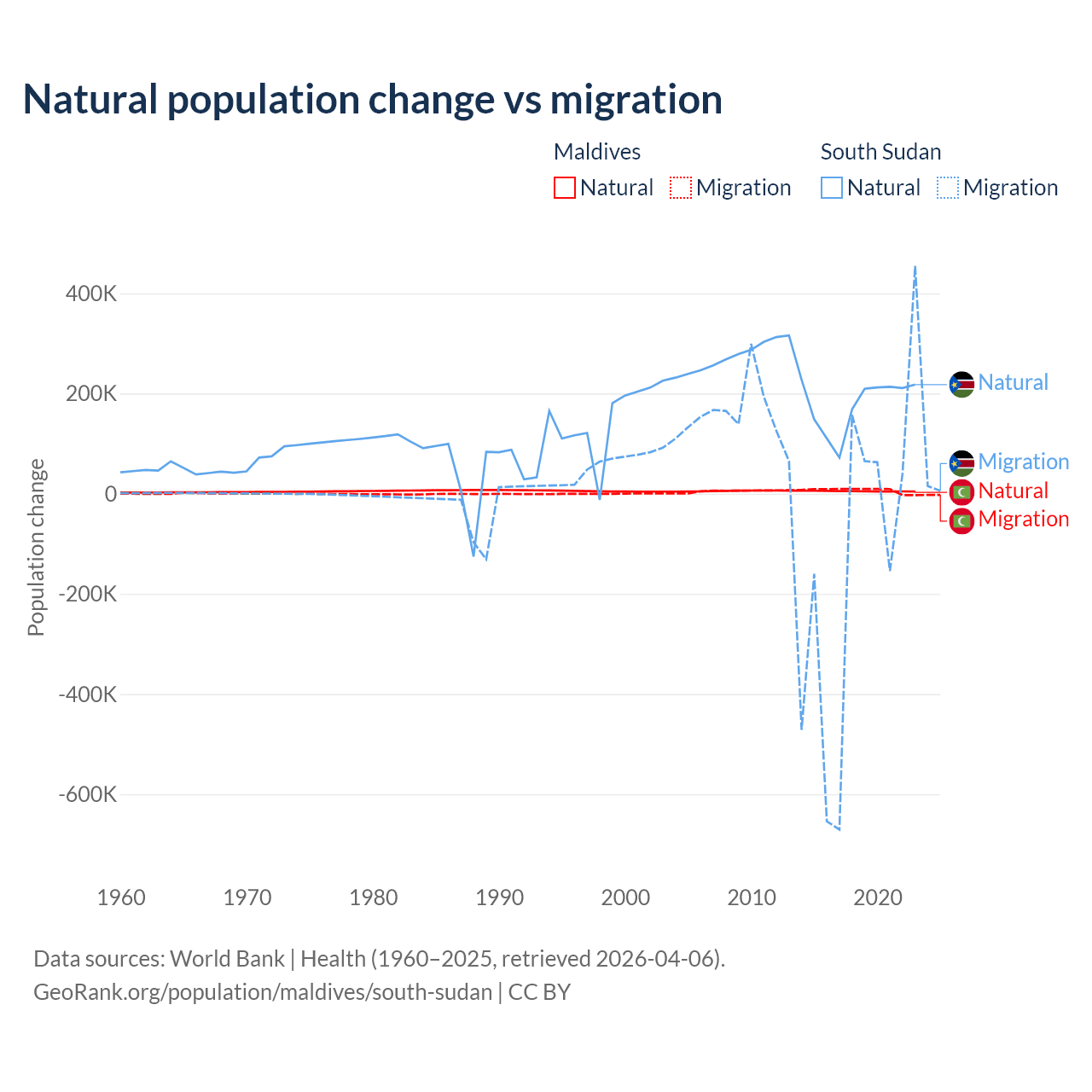 Over the last 10 years, 42.7% of the population change in Maldives is from natural causes (a gain of 51,342 people) and 57.3% is from migration (a gain of 68,788 people). In South Sudan 57.4% is from natural causes (a gain of 1,792,135 people) and 42.6% is from migration (a loss of 1,329,606 people).