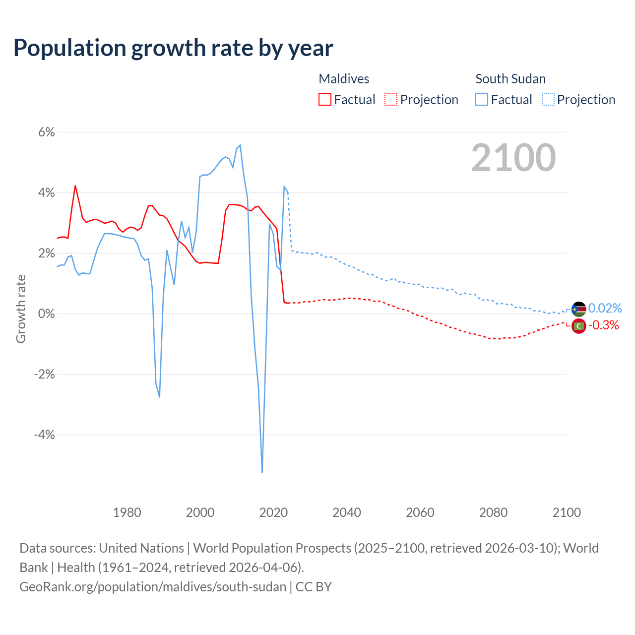 - For the last 10 years, Maldives has had an average growth rate of +2.56% per year vs +0.65% in South Sudan.