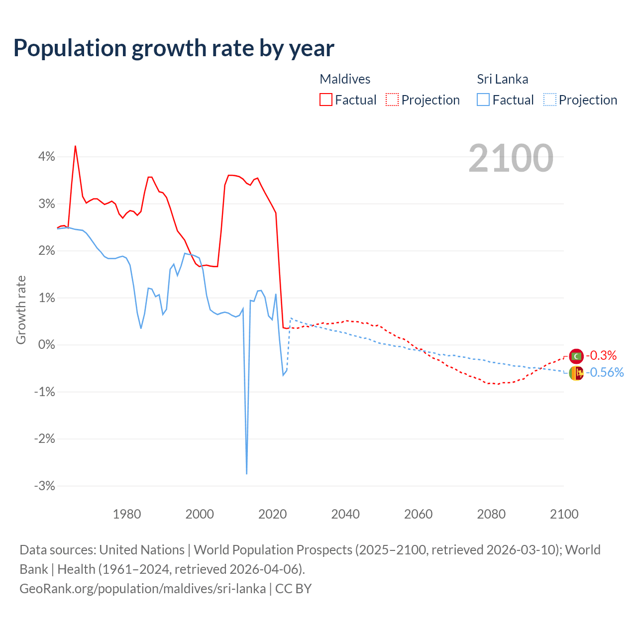 - For the last 10 years, Maldives has had an average growth rate of +2.56% per year vs +0.57% in Sri Lanka.