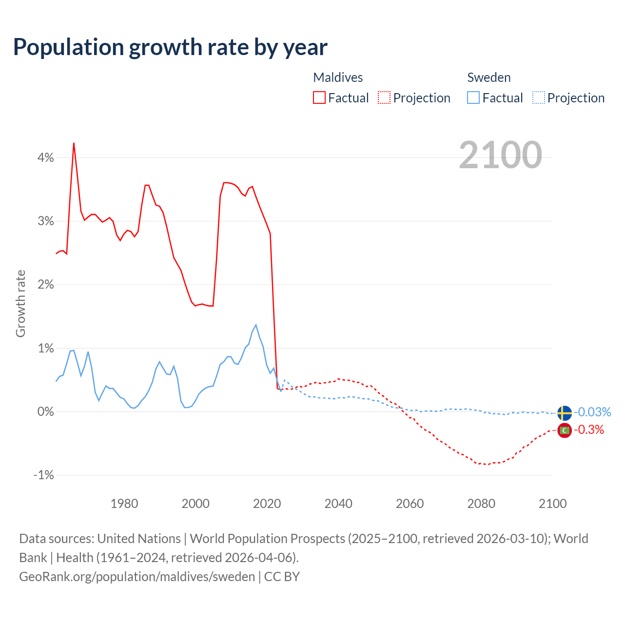- For the last 10 years, Maldives has had an average growth rate of +2.56% per year vs +0.88% in Sweden.