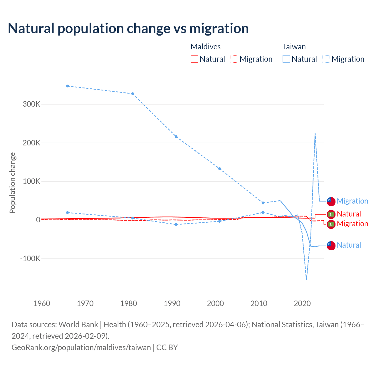 Data sources: World Bank | Health (1960–2025, retrieved 2026-04-06); National Statistics, Taiwan (1966–2024, retrieved 2026-02-09).