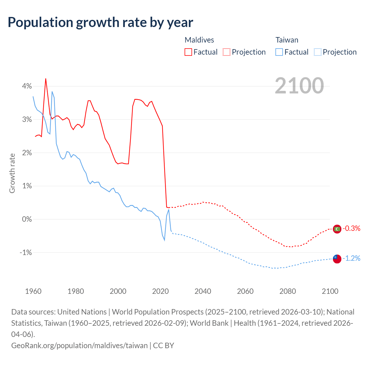 Data sources: World Bank | Health (1960–2024, retrieved 2026-04-06); United Nations | World Population Prospects (1960–2026, retrieved 2026-03-10); U.S. Census Bureau (1960–2025, retrieved 2026-02-08); National Statistics, Taiwan (1960–2025, retrieved 2026-02-09); Central Intelligence Agency (CIA) (2000–2019, retrieved 2026-02-20).