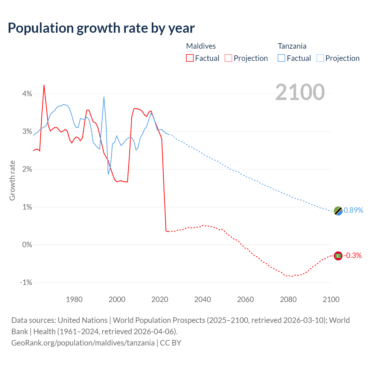- For the last 10 years, Maldives has had an average growth rate of +2.56% per year vs +3.13% in Tanzania.