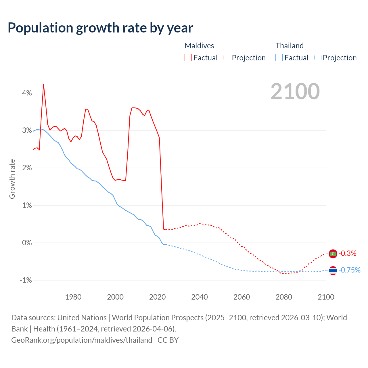 Data sources: World Bank | Health (1960–2024, retrieved 2026-04-06); United Nations | World Population Prospects (1960–2026, retrieved 2026-03-10); U.S. Census Bureau (1960–2025, retrieved 2026-02-08); Central Intelligence Agency (CIA) (2000–2019, retrieved 2026-02-20).