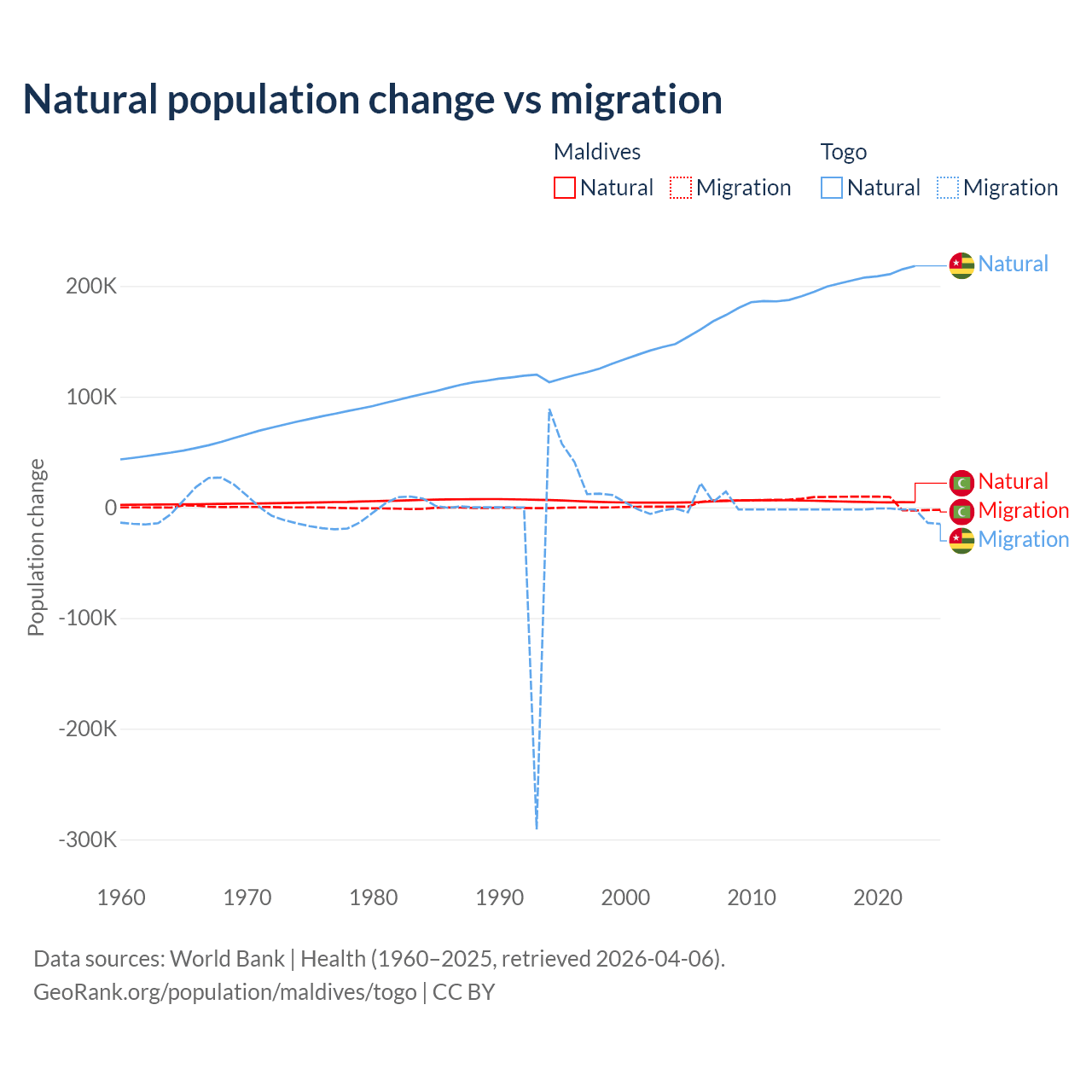 Over the last 10 years, 42.7% of the population change in Maldives is from natural causes (a gain of 51,342 people) and 57.3% is from migration (a gain of 68,788 people). In Togo 99.1% is from natural causes (a gain of 2,052,115 people) and 0.86% is from migration (a loss of 17,852 people).