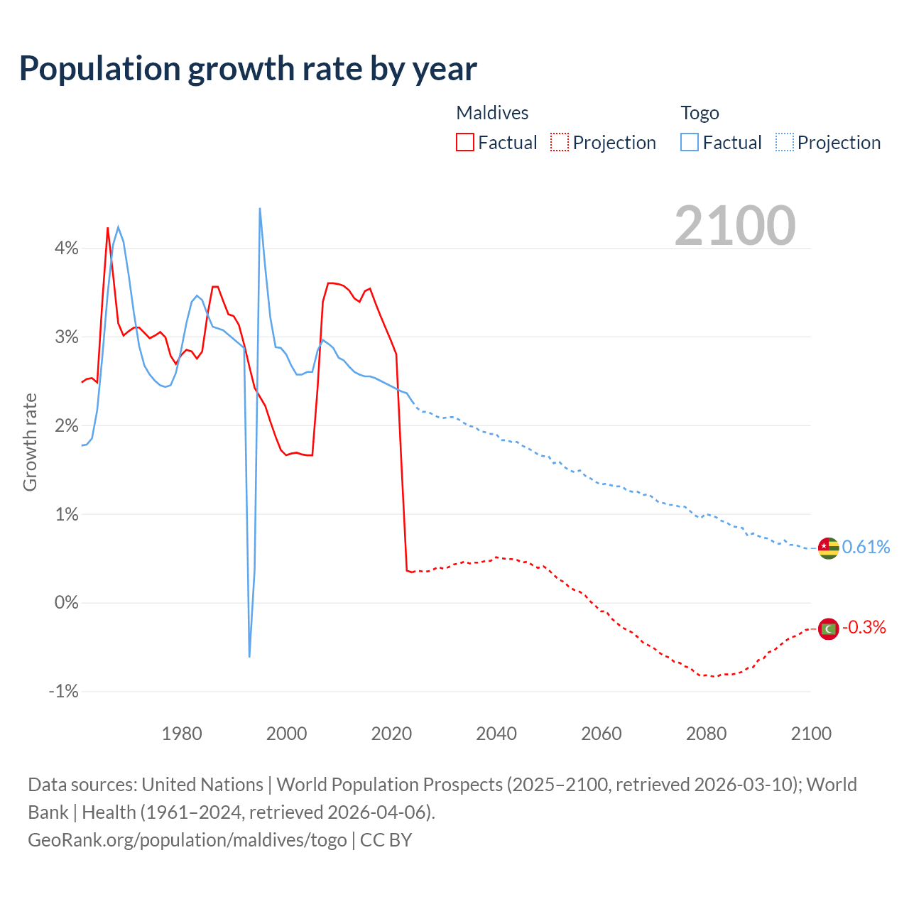 - For the last 10 years, Maldives has had an average growth rate of +2.56% per year vs +2.46% in Togo.