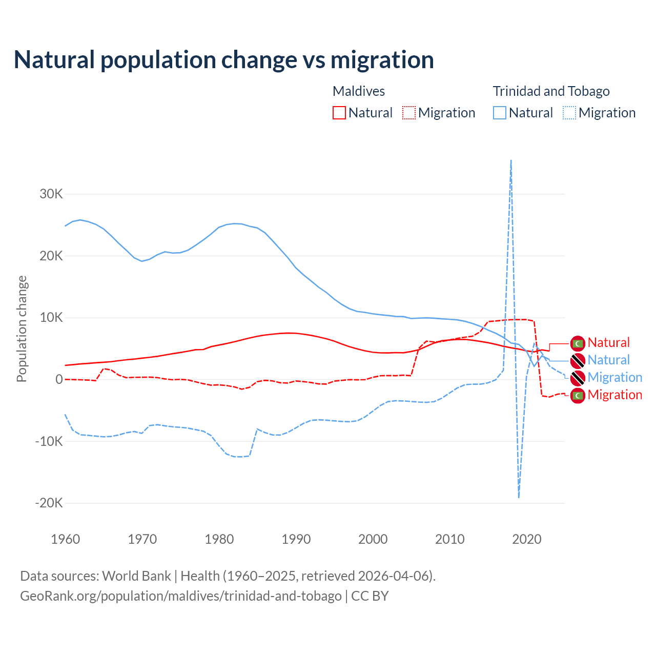 Over the last 10 years, 42.7% of the population change in Maldives is from natural causes (a gain of 51,342 people) and 57.3% is from migration (a gain of 68,788 people). In Trinidad and Tobago 66% is from natural causes (a gain of 55,887 people) and 34% is from migration (a gain of 28,785 people).