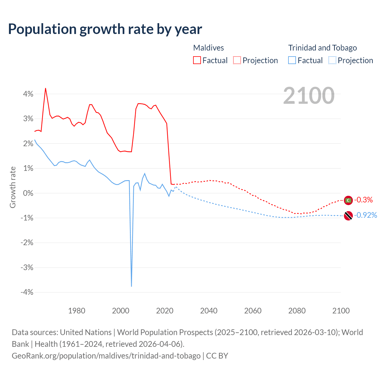 - For the last 10 years, Maldives has had an average growth rate of +2.56% per year vs +0.19% in Trinidad and Tobago.