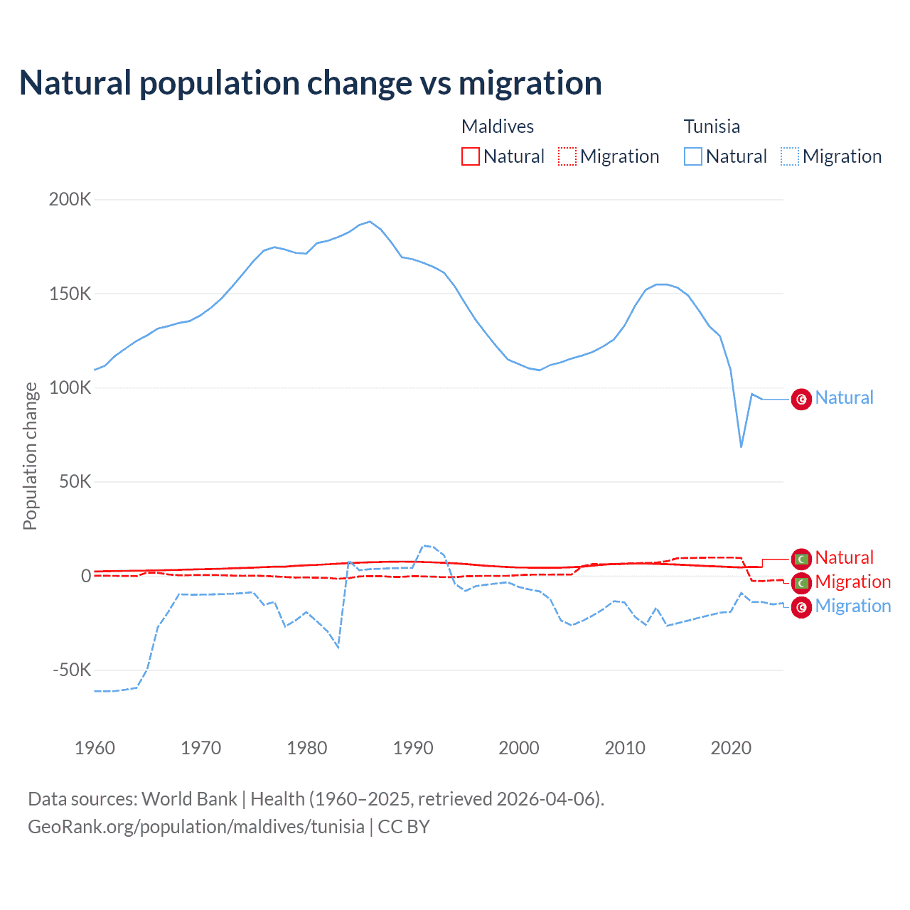 Over the last 10 years, 42.7% of the population change in Maldives is from natural causes (a gain of 51,342 people) and 57.3% is from migration (a gain of 68,788 people). In Tunisia 86.3% is from natural causes (a gain of 1,225,079 people) and 13.7% is from migration (a loss of 195,011 people).