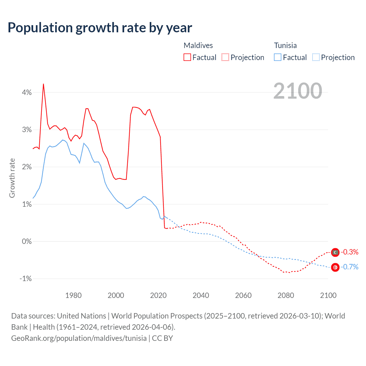 - For the last 10 years, Maldives has had an average growth rate of +2.56% per year vs +0.89% in Tunisia.