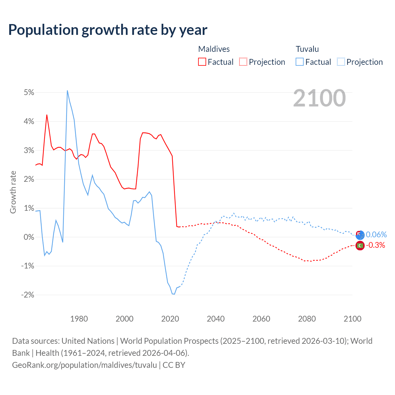 - For the last 10 years, Maldives has had an average growth rate of +2.56% per year vs -1.19% in Tuvalu.
