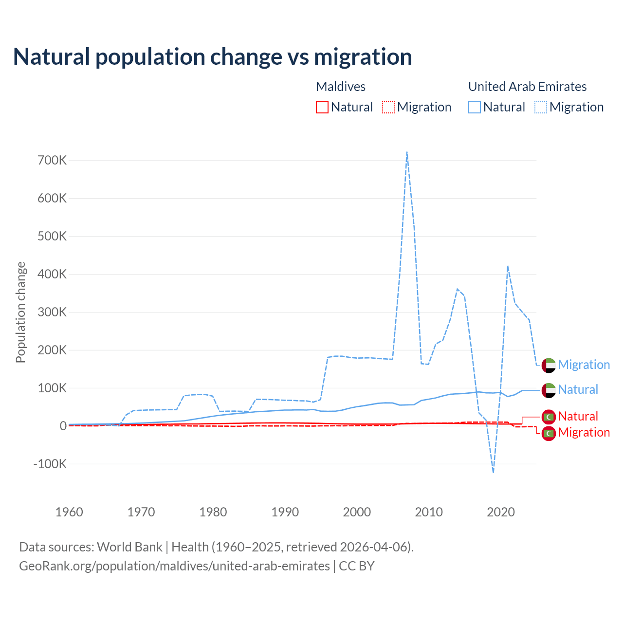 Over the last 10 years, 42.7% of the population change in Maldives is from natural causes (a gain of 51,342 people) and 57.3% is from migration (a gain of 68,788 people). In the United Arab Emirates 30.5% is from natural causes (a gain of 857,996 people) and 69.5% is from migration (a gain of 1,958,520 people).