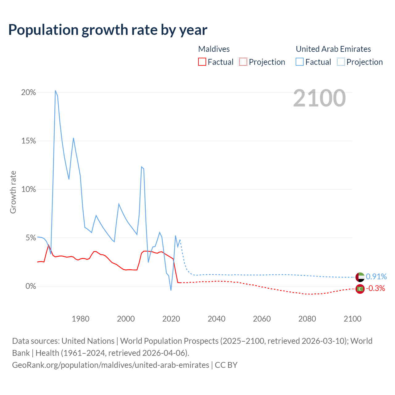 - For the last 10 years, Maldives has had an average growth rate of +2.56% per year vs +3.31% in the United Arab Emirates.