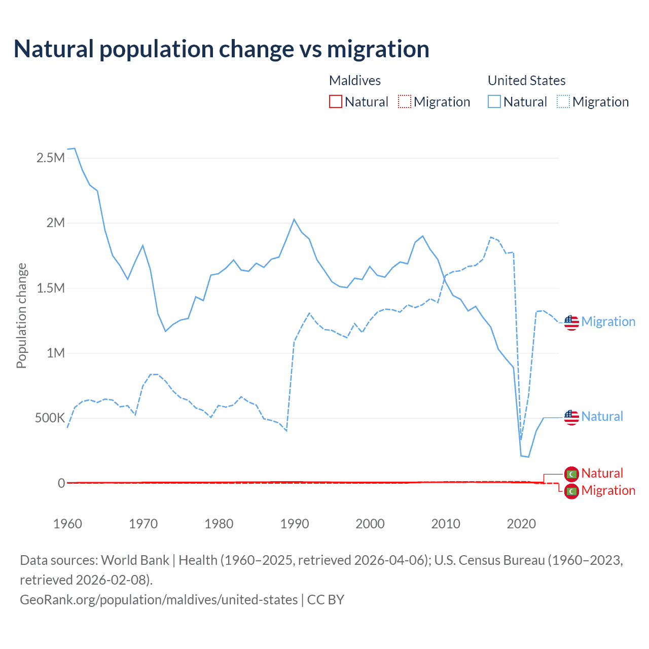 Data sources: World Bank | Health (1960–2025, retrieved 2026-04-06); U.S. Census Bureau (1960–2023, retrieved 2026-02-08).