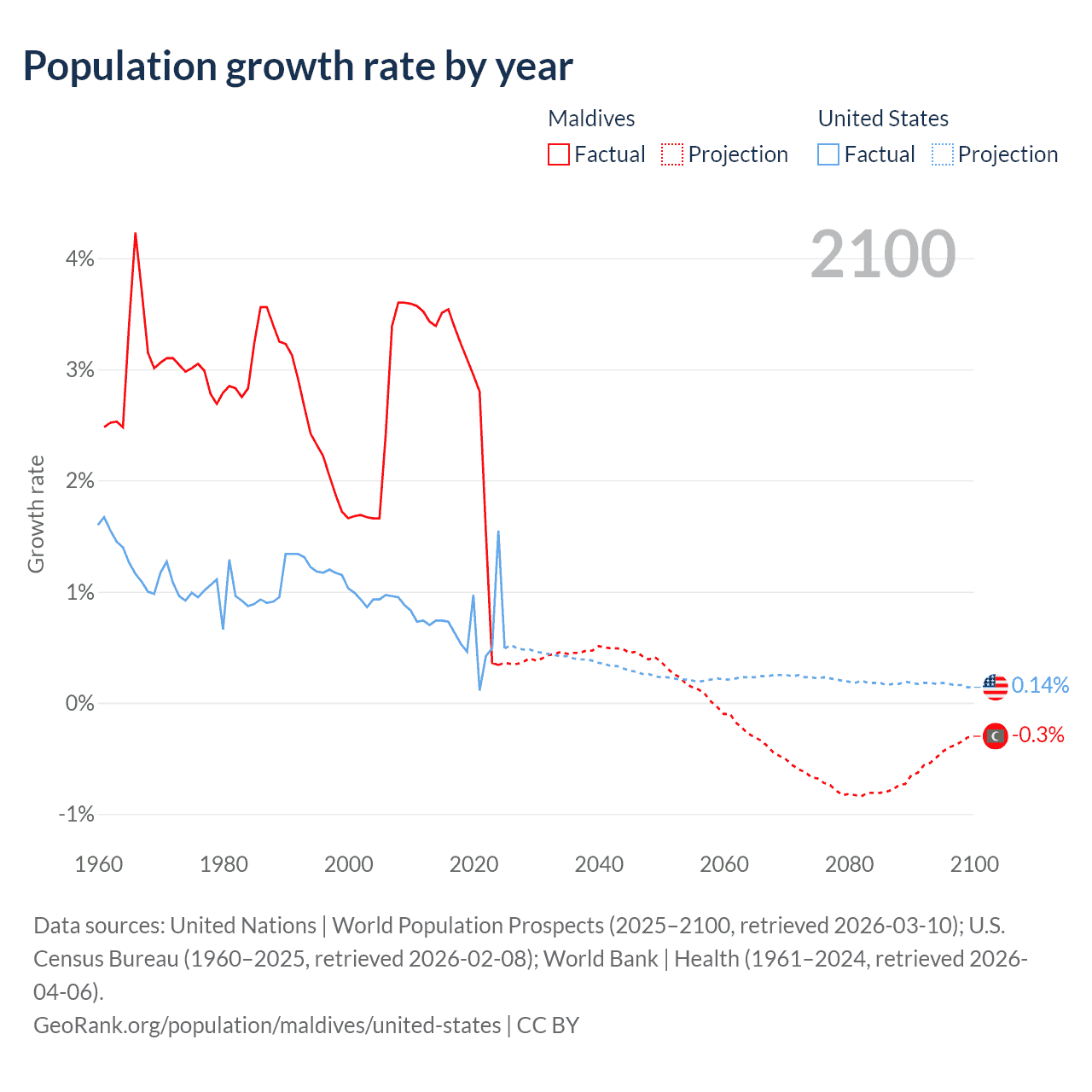 Data sources: World Bank | Health (1960–2024, retrieved 2026-04-06); United Nations | World Population Prospects (1960–2026, retrieved 2026-03-10); U.S. Census Bureau (1960–2025, retrieved 2026-02-08); Central Intelligence Agency (CIA) (2000–2019, retrieved 2026-02-20).