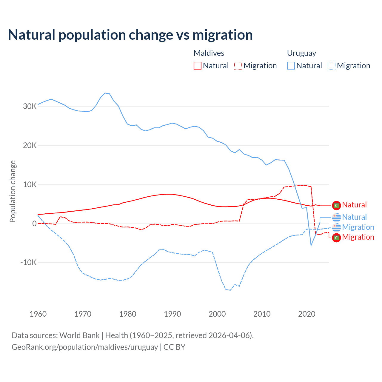 Over the last 10 years, 42.7% of the population change in Maldives is from natural causes (a gain of 51,342 people) and 57.3% is from migration (a gain of 68,788 people). In Uruguay 70% is from natural causes (a gain of 64,303 people) and 30% is from migration (a loss of 27,501 people).