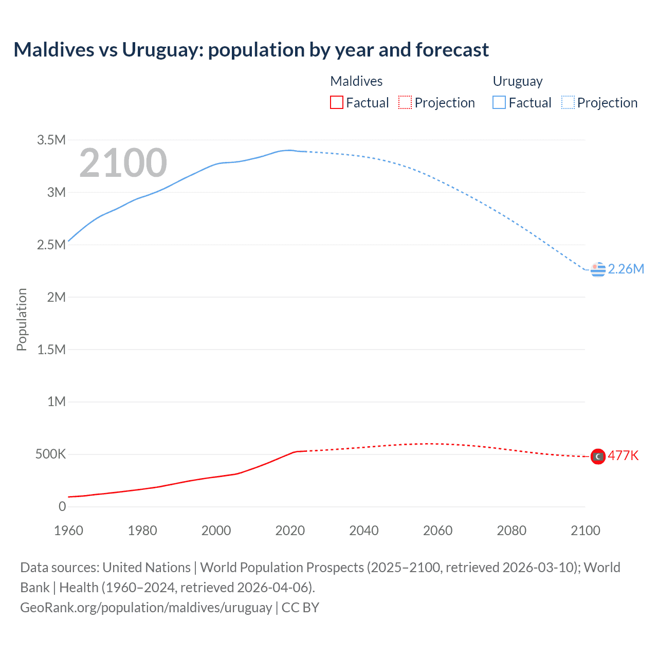 Maldives vs Uruguay: population by year and forecast