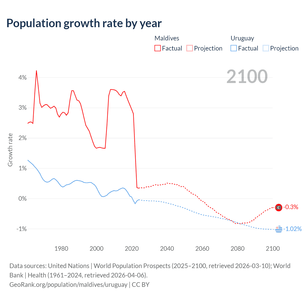 - For the last 10 years, Maldives has had an average growth rate of +2.56% per year vs +0.11% in Uruguay.