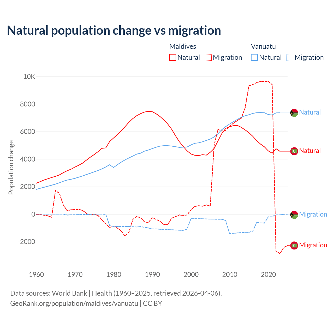 Over the last 10 years, 42.7% of the population change in Maldives is from natural causes (a gain of 51,342 people) and 57.3% is from migration (a gain of 68,788 people). In Vanuatu 92.2% is from natural causes (a gain of 72,941 people) and 7.81% is from migration (a loss of 6,181 people).