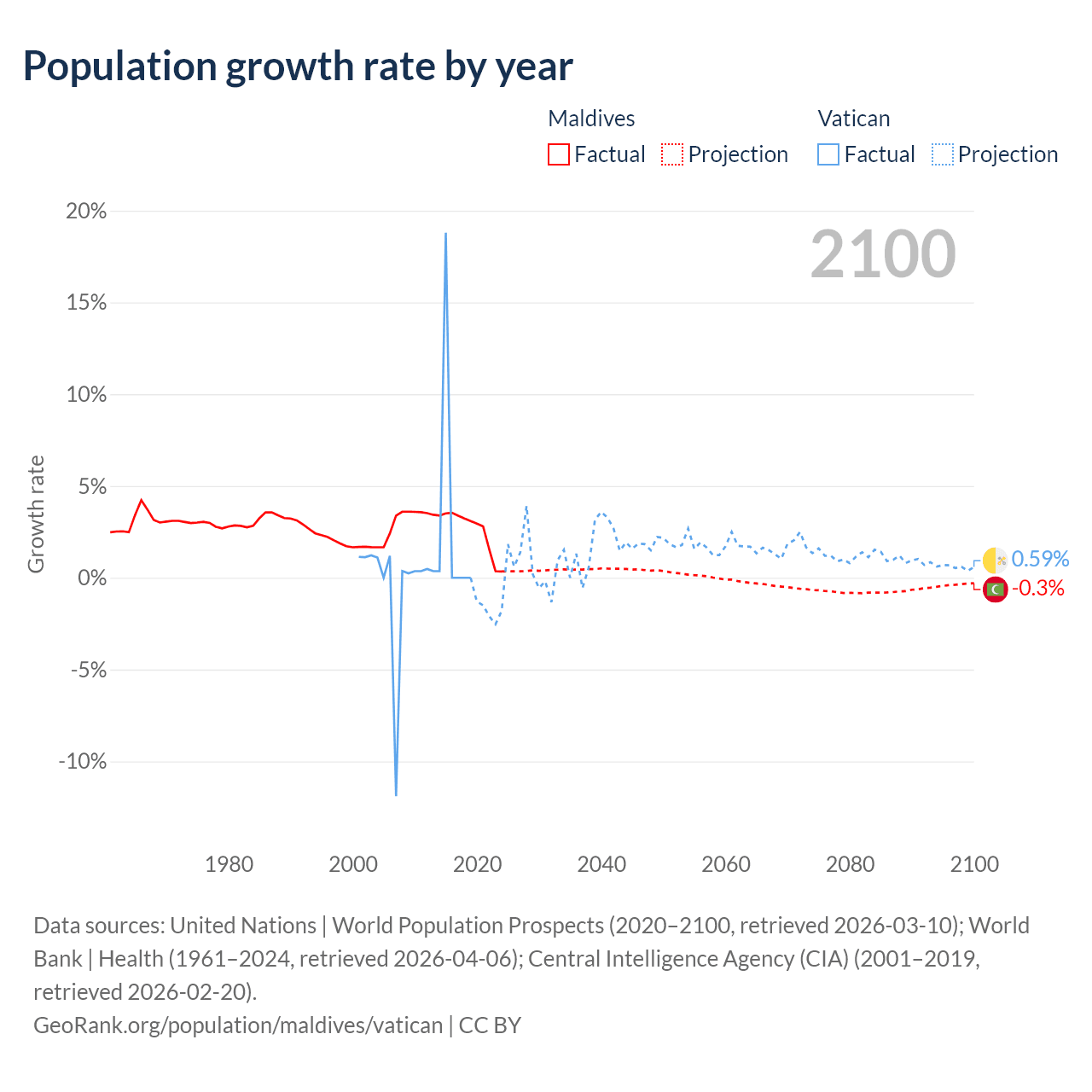 Data sources: World Bank | Health (1960–2024, retrieved 2026-04-06); United Nations | World Population Prospects (1960–2026, retrieved 2026-03-10); U.S. Census Bureau (1960–2025, retrieved 2026-02-08); Central Intelligence Agency (CIA) (2000–2019, retrieved 2026-02-20).