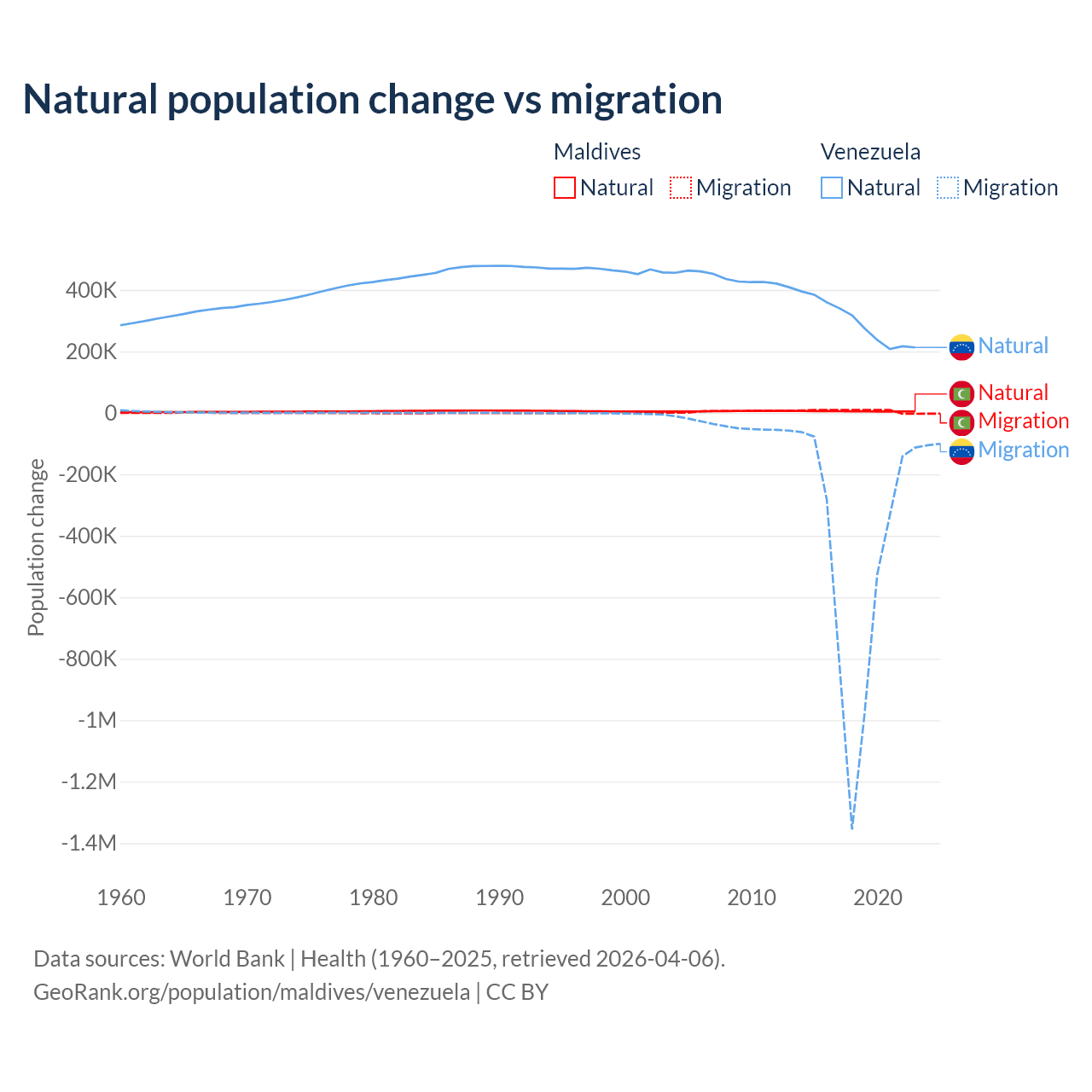 Over the last 10 years, 42.7% of the population change in Maldives is from natural causes (a gain of 51,342 people) and 57.3% is from migration (a gain of 68,788 people). In Venezuela 38.6% is from natural causes (a gain of 2,946,257 people) and 61.4% is from migration (a loss of 4,683,227 people).