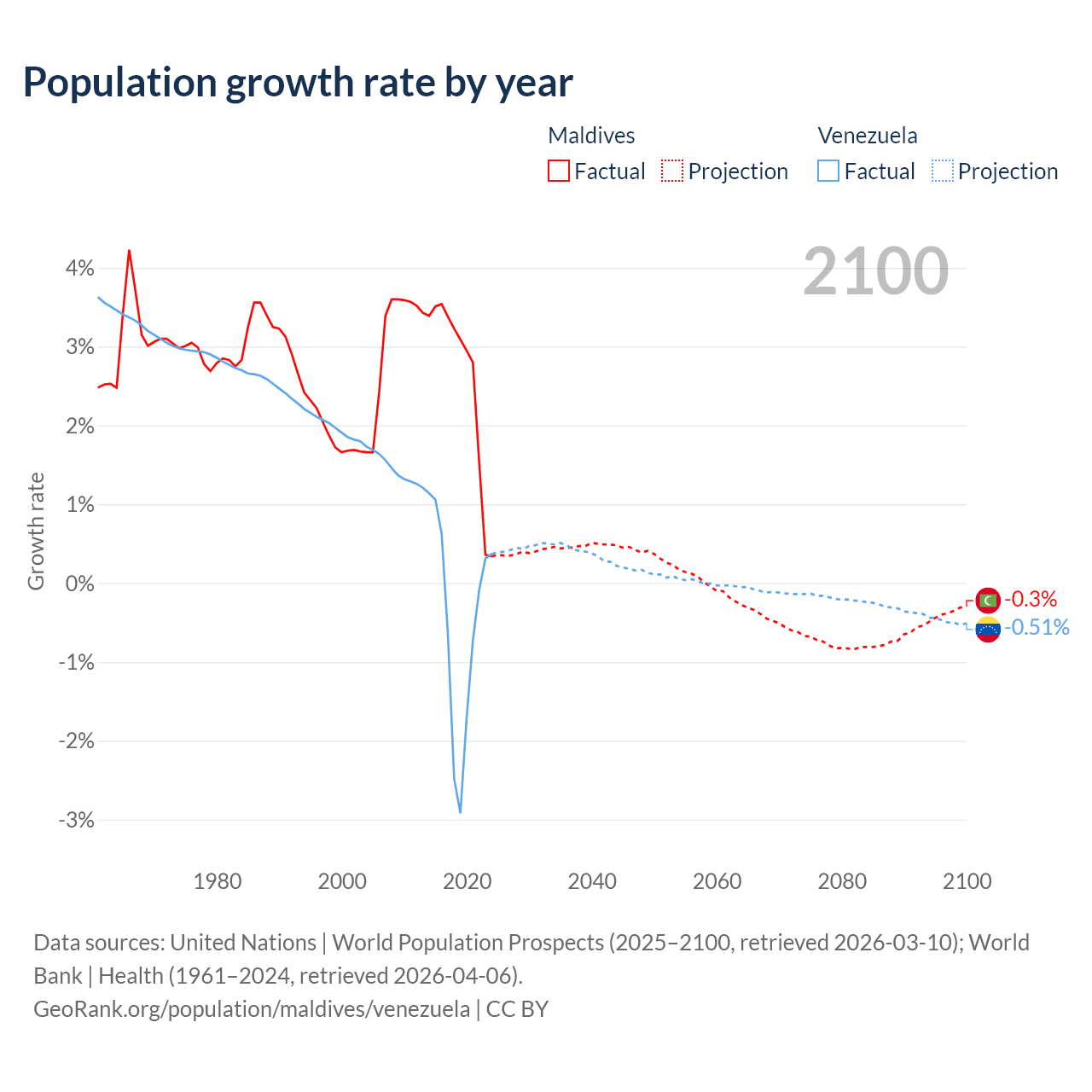 - For the last 10 years, Maldives has had an average growth rate of +2.56% per year vs -0.46% in Venezuela.