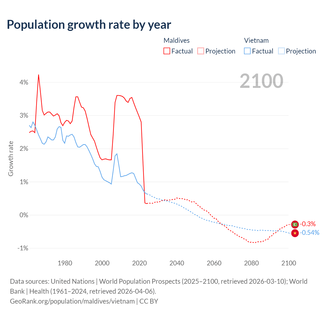 - For the last 10 years, Maldives has had an average growth rate of +2.56% per year vs +0.99% in Vietnam.