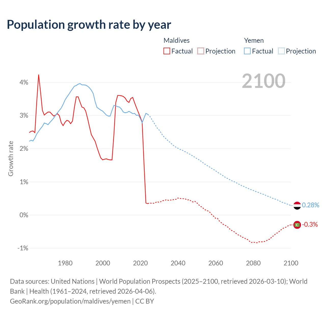 - For the last 10 years, Maldives has had an average growth rate of +2.56% per year vs +3% in Yemen.