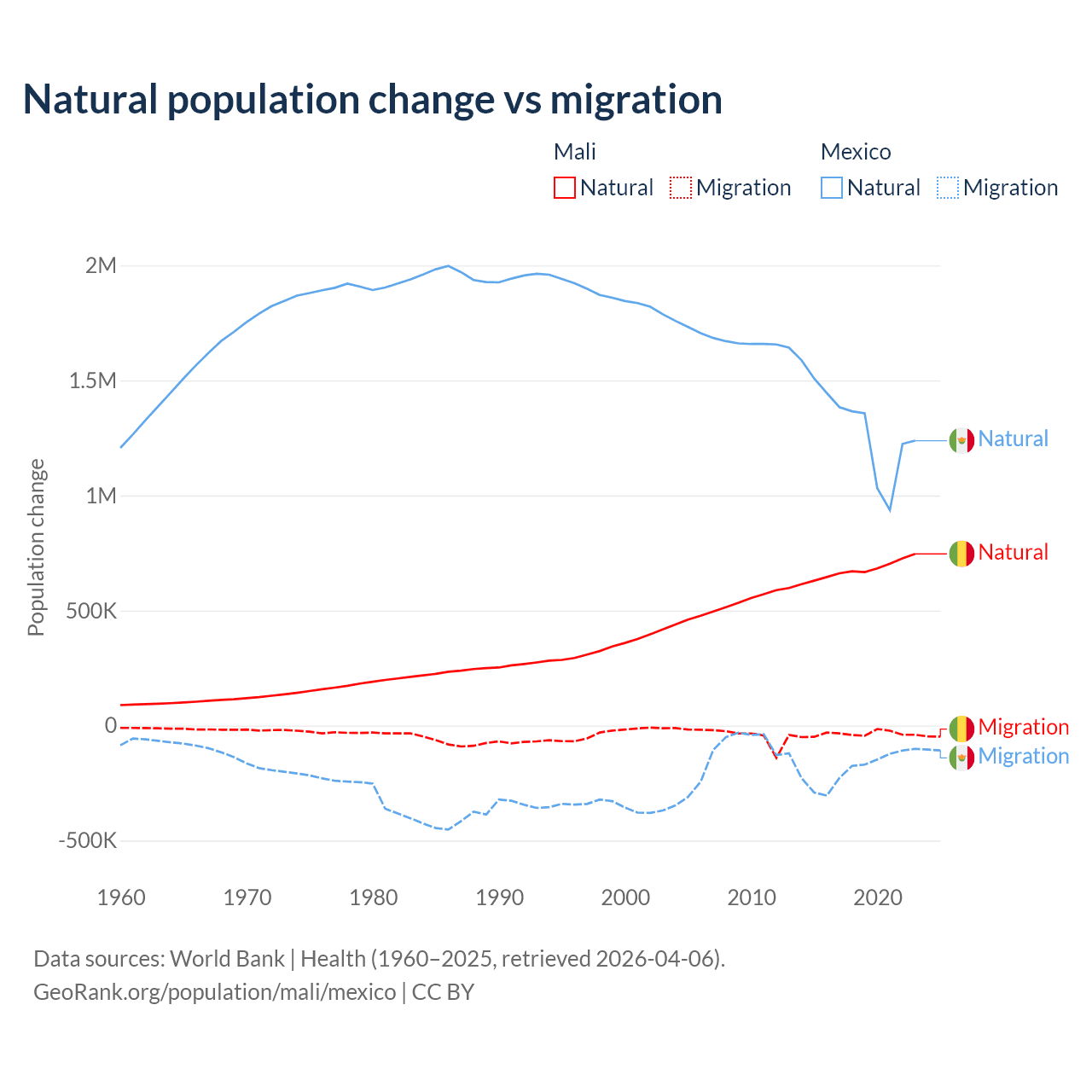 Over the last 10 years, 94.9% of the population change in Mali is from natural causes (a gain of 6,749,473 people) and 5.13% is from migration (a loss of 365,292 people). In Mexico 87.5% is from natural causes (a gain of 13,080,136 people) and 12.5% is from migration (a loss of 1,876,544 people).