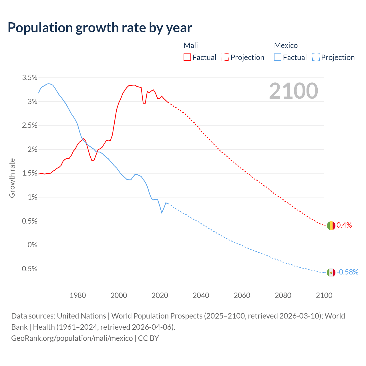 - For the last 10 years, Mali has had an average growth rate of +3.12% per year vs +0.92% in Mexico.