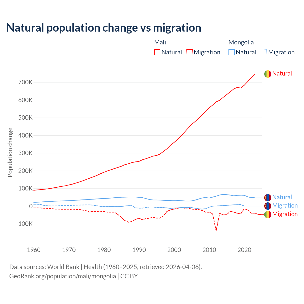 Over the last 10 years, 94.9% of the population change in Mali is from natural causes (a gain of 6,749,473 people) and 5.13% is from migration (a loss of 365,292 people). In Mongolia 94.1% is from natural causes (a gain of 580,367 people) and 5.87% is from migration (a gain of 36,163 people).