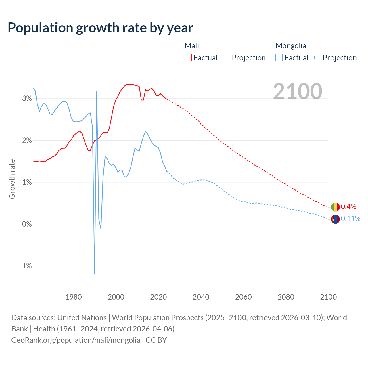 - For the last 10 years, Mali has had an average growth rate of +3.12% per year vs +1.79% in Mongolia.