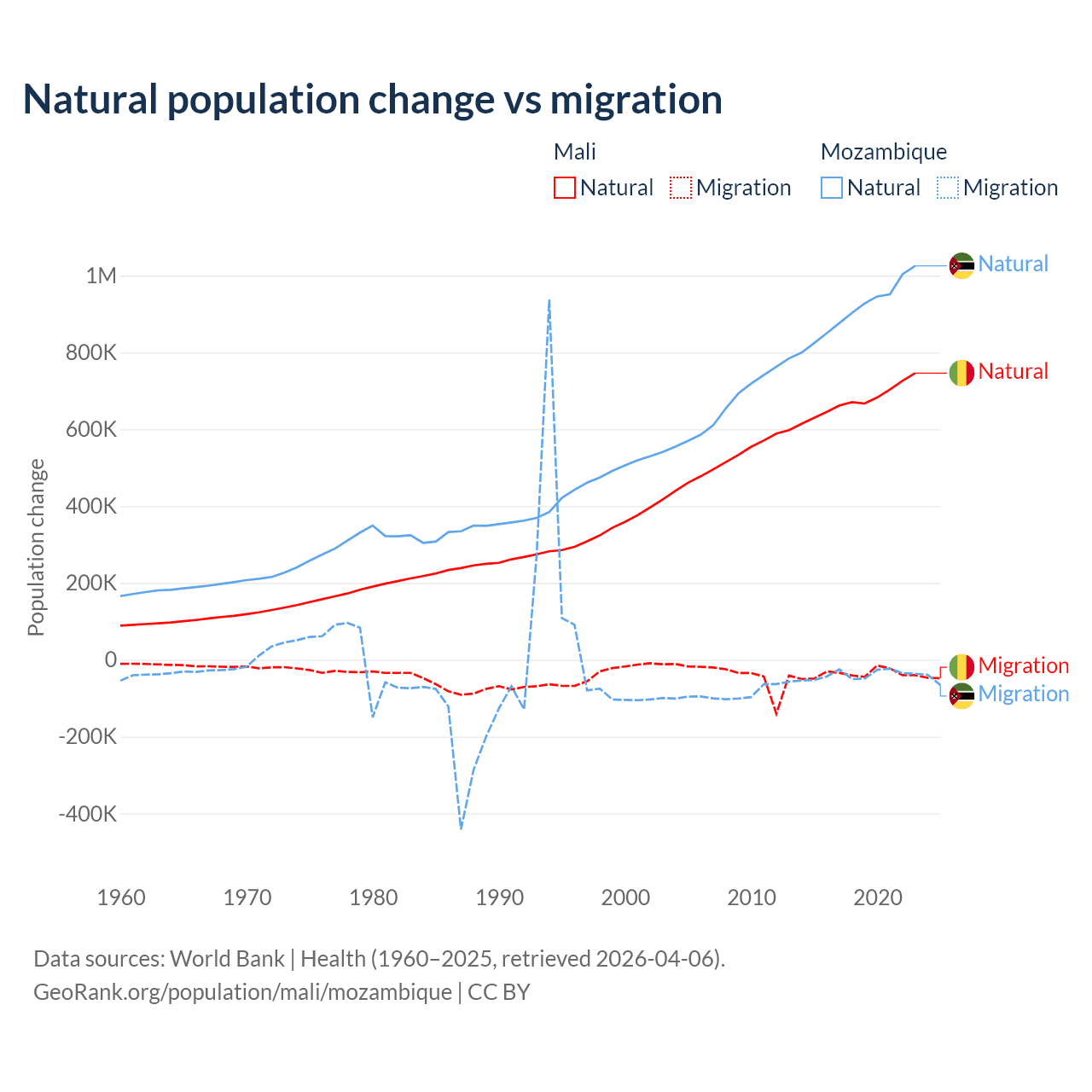 Over the last 10 years, 94.9% of the population change in Mali is from natural causes (a gain of 6,749,473 people) and 5.13% is from migration (a loss of 365,292 people). In Mozambique 95.9% is from natural causes (a gain of 9,108,203 people) and 4.15% is from migration (a loss of 393,923 people).