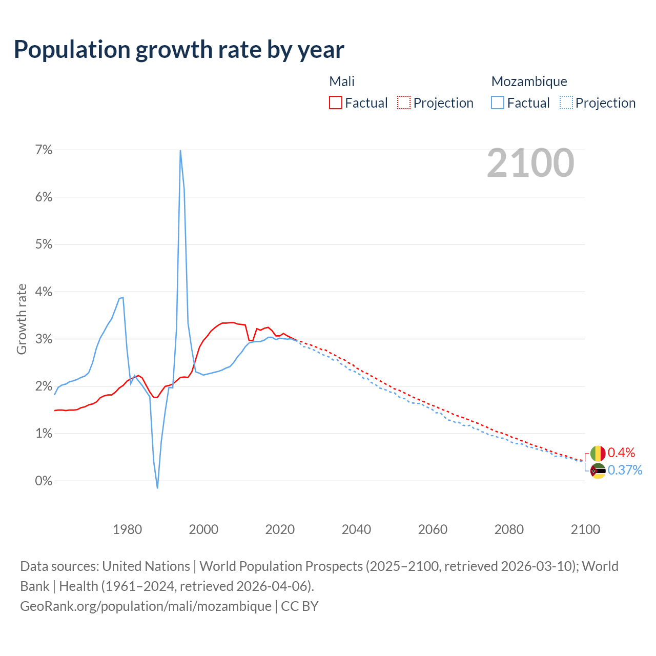 - For the last 10 years, Mali has had an average growth rate of +3.12% per year vs +2.99% in Mozambique.